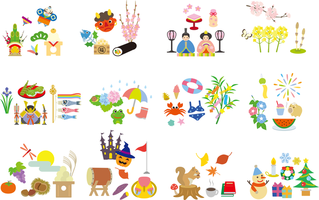 「1月」お正月、七草かゆ、成人式 書初め。「2月」節分、バレンタインデー。「3月」ひな祭り、ホワイトデー、お彼岸。「4月」エイプリルフール、お花見、入園・入学式、花まつり。「5月」こどもの日・端午の節句、母の日、ゴールデンウィーク、八十八夜。「6月」田植え、衣替え、蛍狩り、父の日、梅雨、夏至。「7月」七夕、お中元、海開き・山開き、土用の丑の日、暑中見舞い。「8月」夏休み、夏祭り、お盆、帰省、花火。「9月」敬老の日、重陽の節句、お月見・十五夜、二百十日、秋祭り。「10月」衣替え、体育の日、ハロウィン、十三夜、紅葉狩り。「11月」七五三、文化の日、ボジョレヌーボー、勤労感謝の日、酉の市。「12月」お歳暮、クリスマス、すす払い、大掃除、冬至、年越し。